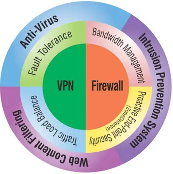 UTM (Unify Threatment Management), trata-se do firewall ativando-se diversas outras facilidades como AV/Anti-Malware, WebFilter (Filtro de Conteúdo), Anti-Spam, IPS (Prevenção de Invasões), DLP (Prevenção de Roubo de Dados), etc.